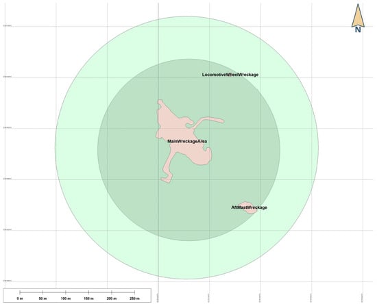 A key objective of the 2022 fieldwork was to chart the full extent of the debris field created by the catastrophic secondary explosion in Hold No. 4. Prior to this survey, the debris field was estimated at 10.9 hectares, based on unverified positional data taken from the wrecksite.eu website. The new survey revealed substantial additional wreckage far beyond these limits, with significant components located as far as 200 m from the main wreck, including a one-tonne locomotive wheel lying 180 m away. These discoveries extend the known debris field to at least 21.9 hectares, doubling the recorded area of dispersed artefacts and wreckage (Figure 23).