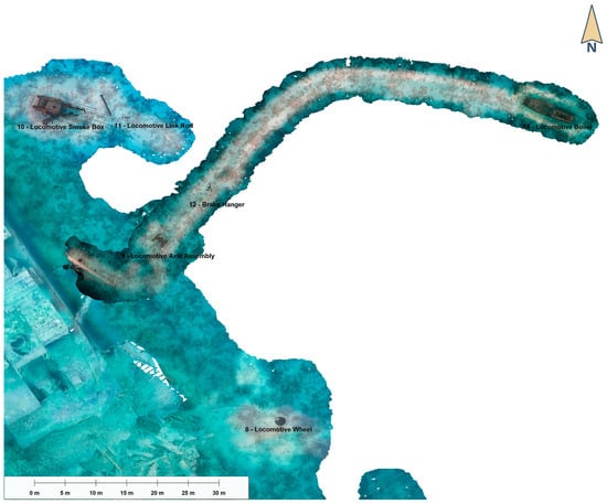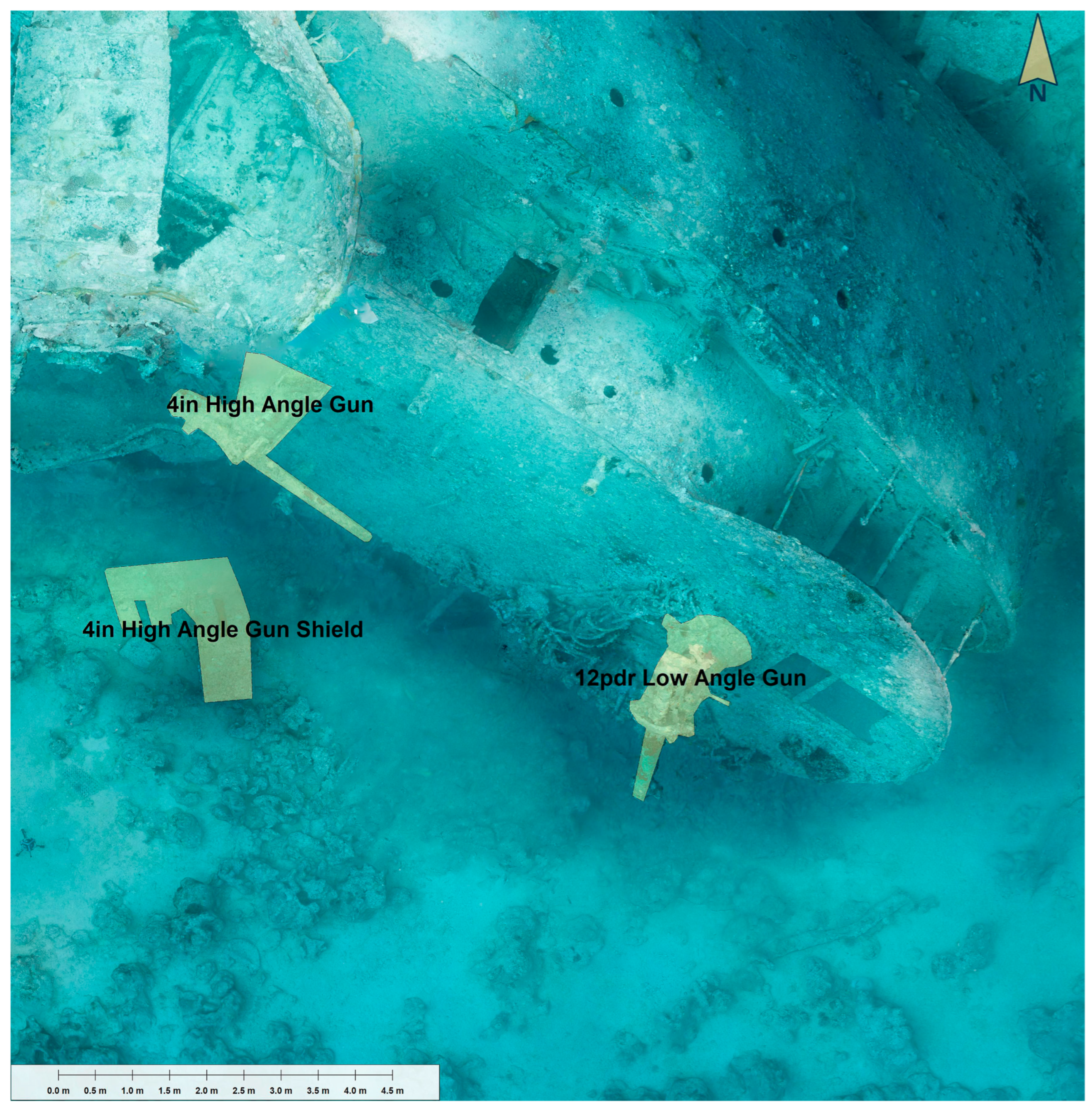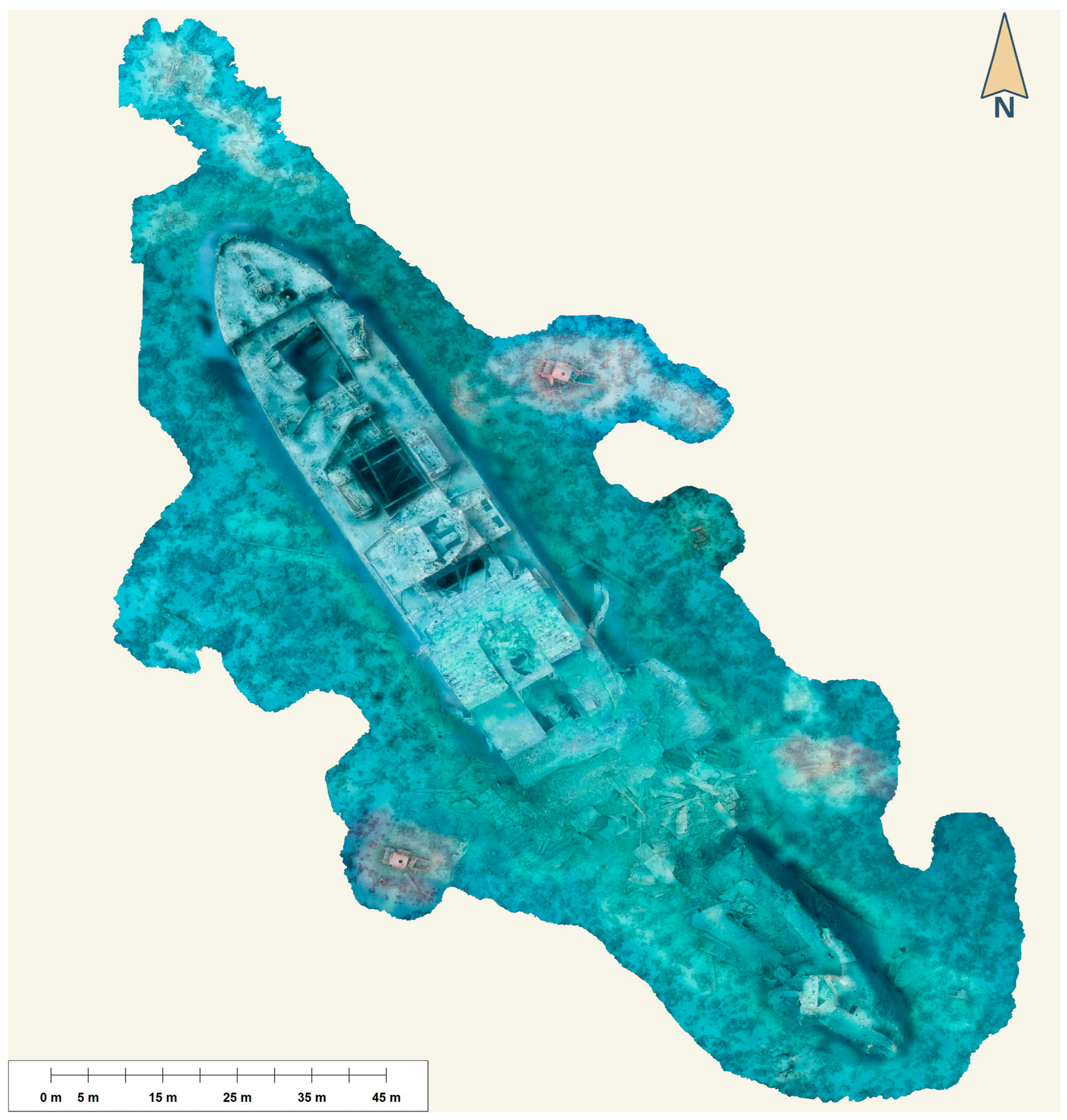 In 2022, a follow-up survey was conducted with seven dives over 357 min (5 h and 57 min of in-water time), capturing an additional 10,365 images and generating 246 GB of data, processed in Agisoft Metashape Professional 1.83. The 2022 season had two primary goals: to record changes to the ship’s structure, features, and artefacts since the 2017 baseline to assess the ongoing impacts of recreational diving, and to extend the survey area to map the debris field created by the secondary explosion that sank the ship, which scattered material, including two partial locomotives, across the seabed.
