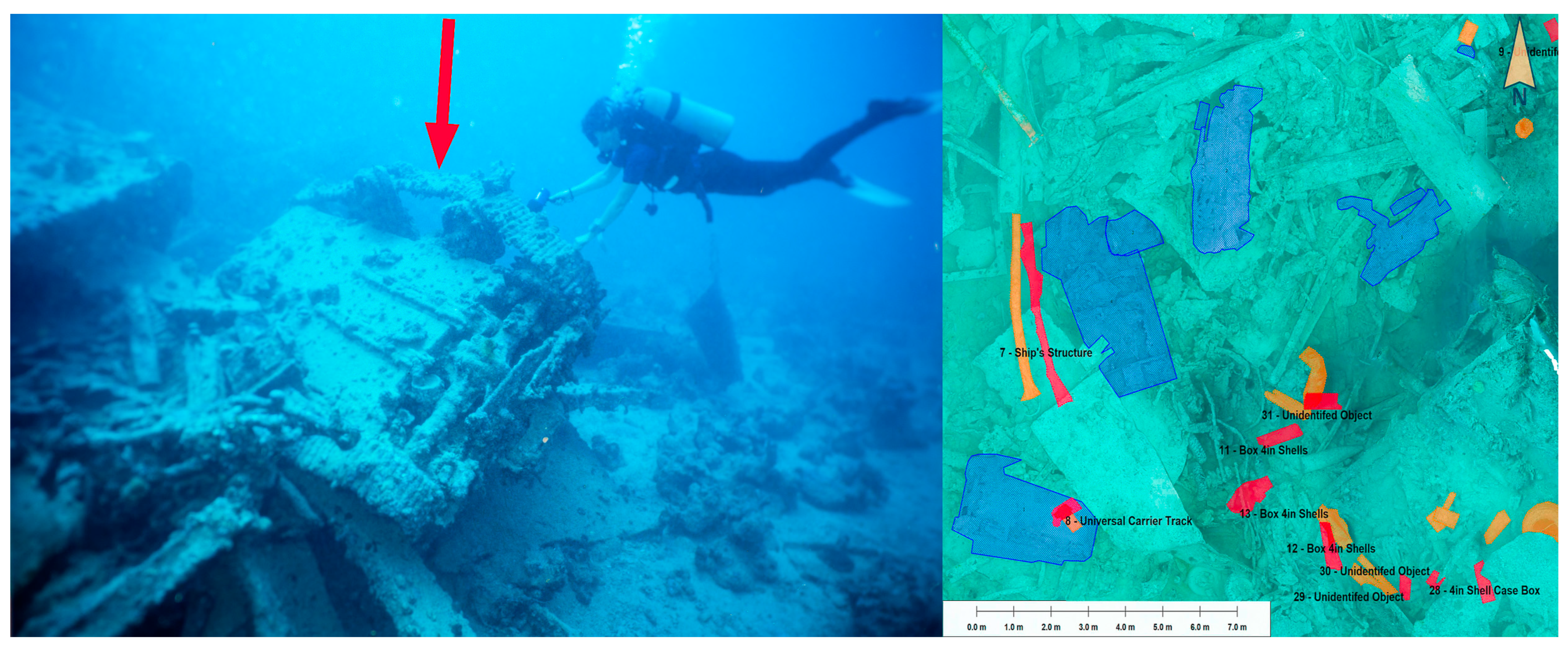 16]. In this current paper the focus is on analysing the results of the photogrammetric surveys conducted in 2017 and 2022, with particular attention given to identifying and assessing damage to the wreck over time.