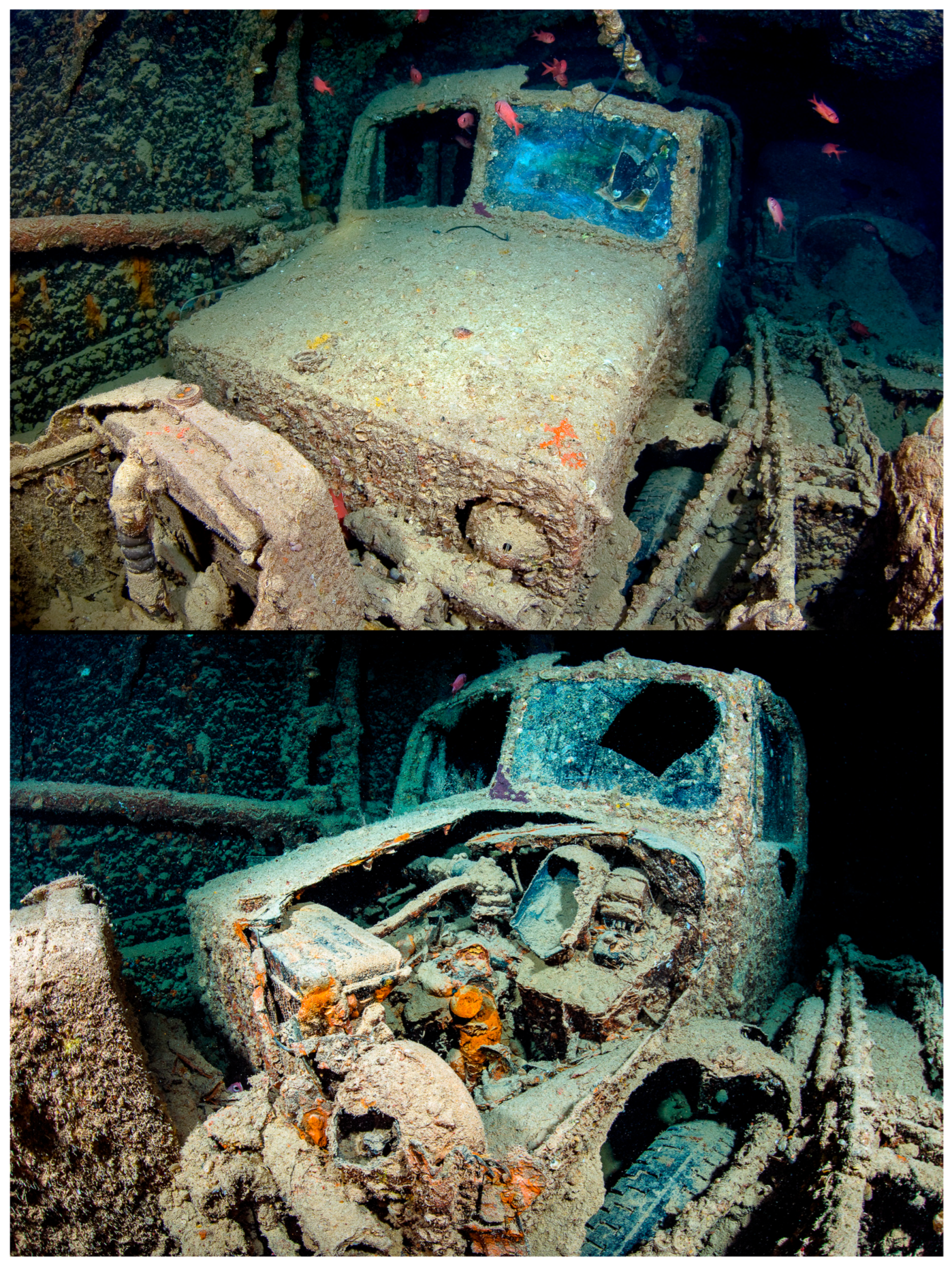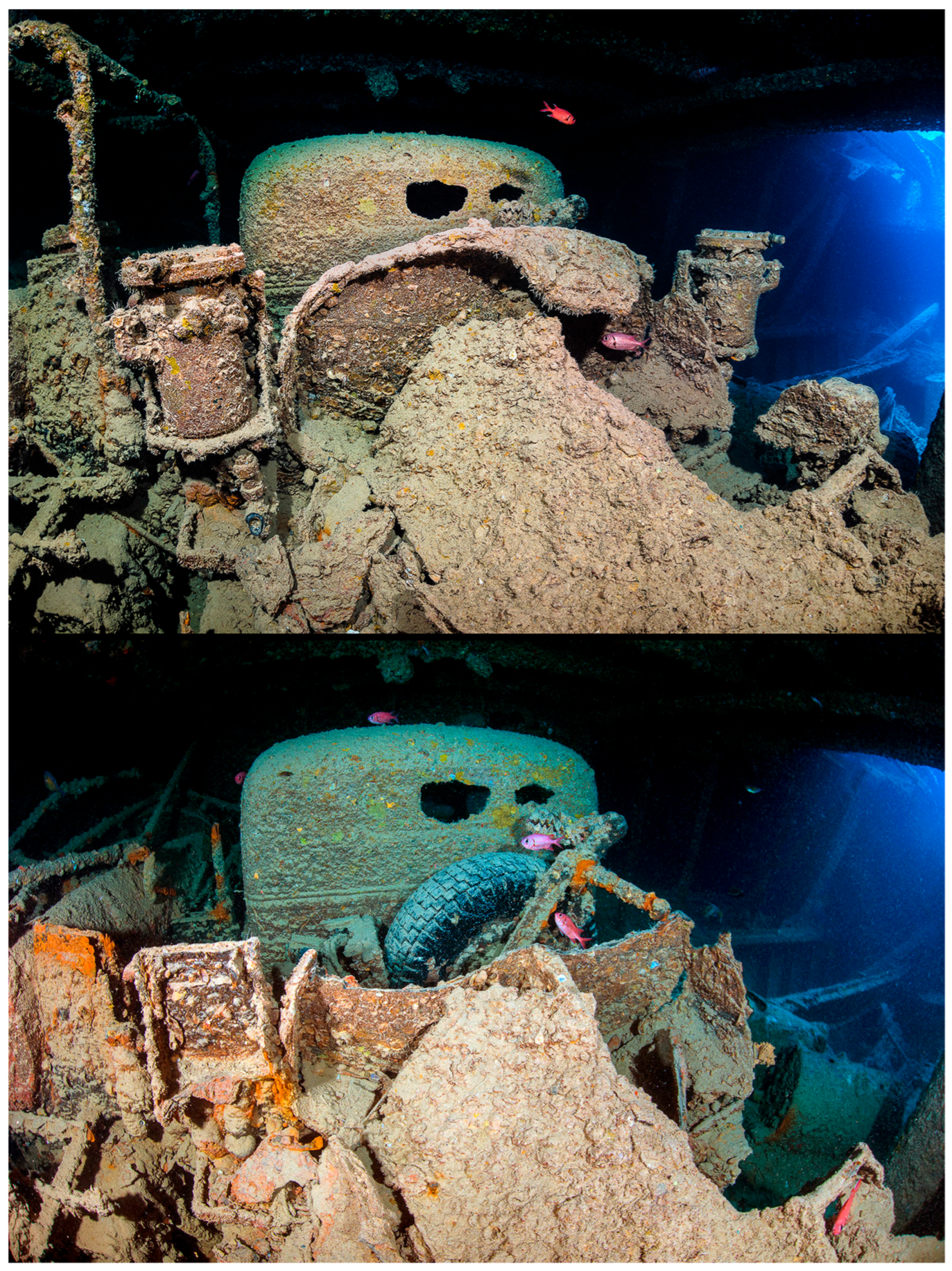Since 2005, underwater photographer Alex Mustard has systematically documented the SS Thistlegorm and its cargo, building an invaluable visual archive that has proven critical for monitoring changes to the wreck over time. His images provide clear evidence of deliberate artefact removal, particularly of non-ferrous objects associated with the vehicles in the cargo holds, and offer detailed insights into the condition of the wreck prior to the first photogrammetric survey in 2017.