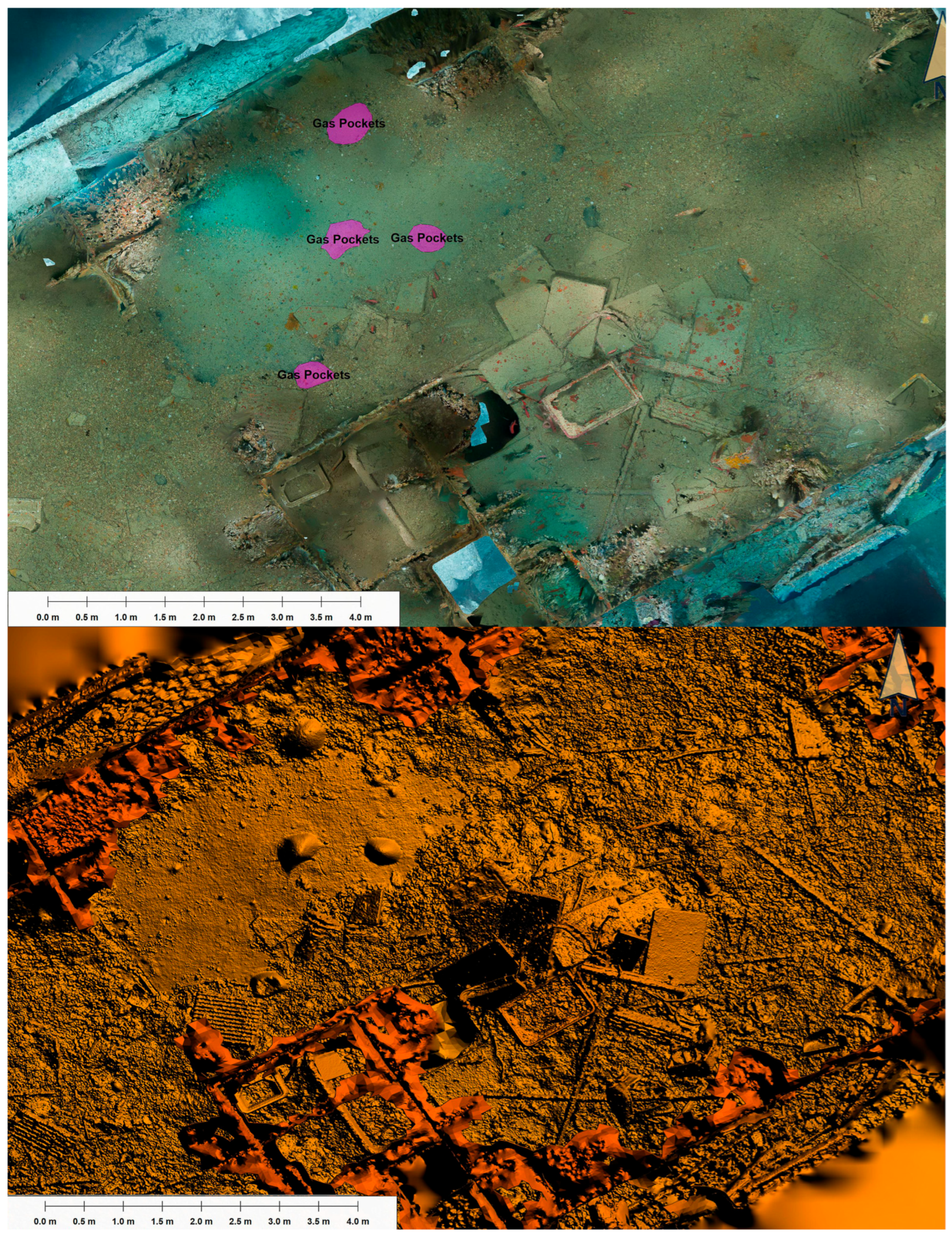 Change detection between the 2017 and 2022 models combined automated and manual procedures. Once both datasets were co-registered within the same local reference system, a point-to-point distance analysis was conducted in CloudCompare to examine spatial differences on point clouds across the wreck surface. Any detected variations were then verified against the orthomosaics in Global Mapper and the high-resolution textured models to distinguish genuine structural or artefactual change from noise caused by lighting variation or biological growth. This integrated workflow allowed both quantitative measurement and qualitative interpretation of change, ensuring that detected differences represented real changes on the wreck.