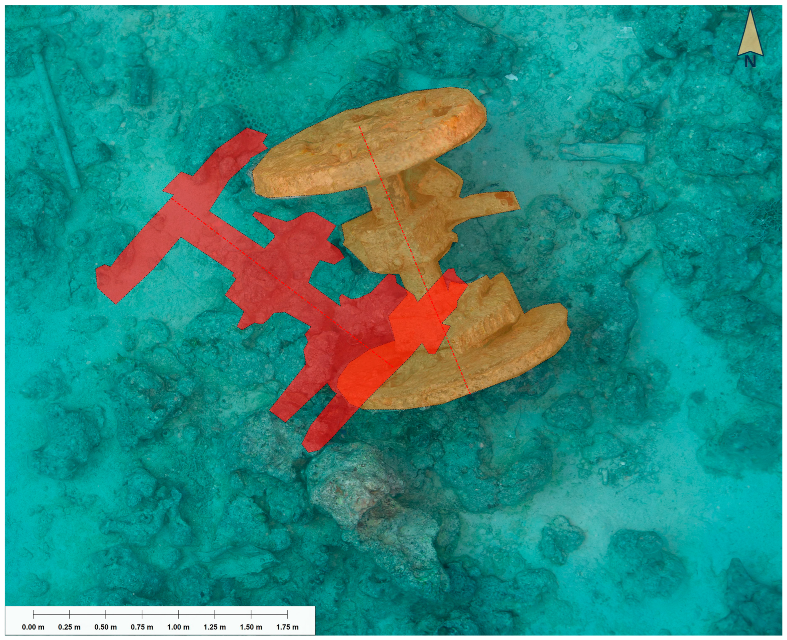 Figure 21). The most plausible explanation for this movement is entanglement with mooring lines from dive vessels, illustrating how even heavy artefacts can be vulnerable to unintentional displacement.