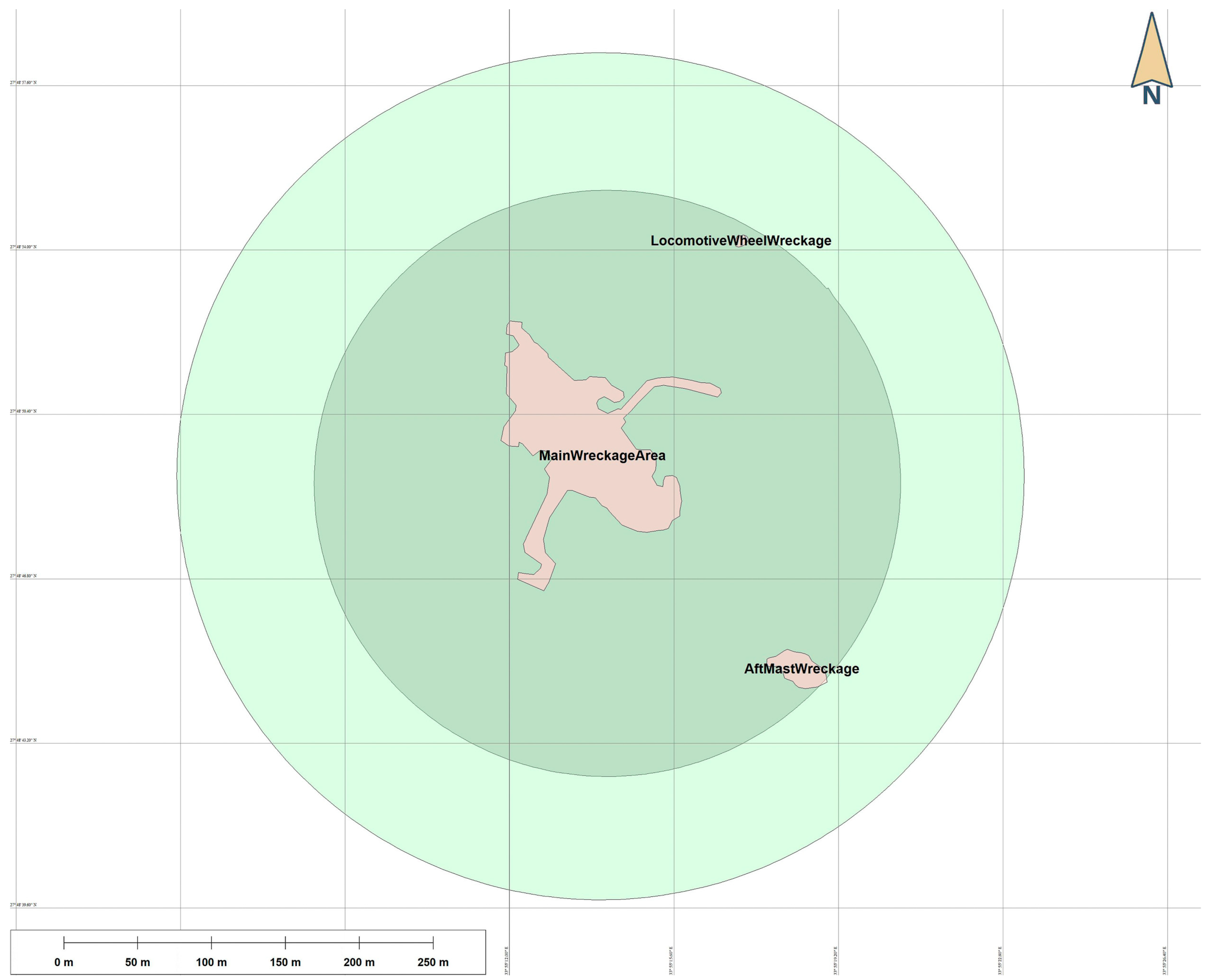 A key objective of the 2022 fieldwork was to chart the full extent of the debris field created by the catastrophic secondary explosion in Hold No. 4. Prior to this survey, the debris field was estimated at 10.9 hectares, based on unverified positional data taken from the wrecksite.eu website. The new survey revealed substantial additional wreckage far beyond these limits, with significant components located as far as 200 m from the main wreck, including a one-tonne locomotive wheel lying 180 m away. These discoveries extend the known debris field to at least 21.9 hectares, doubling the recorded area of dispersed artefacts and wreckage (