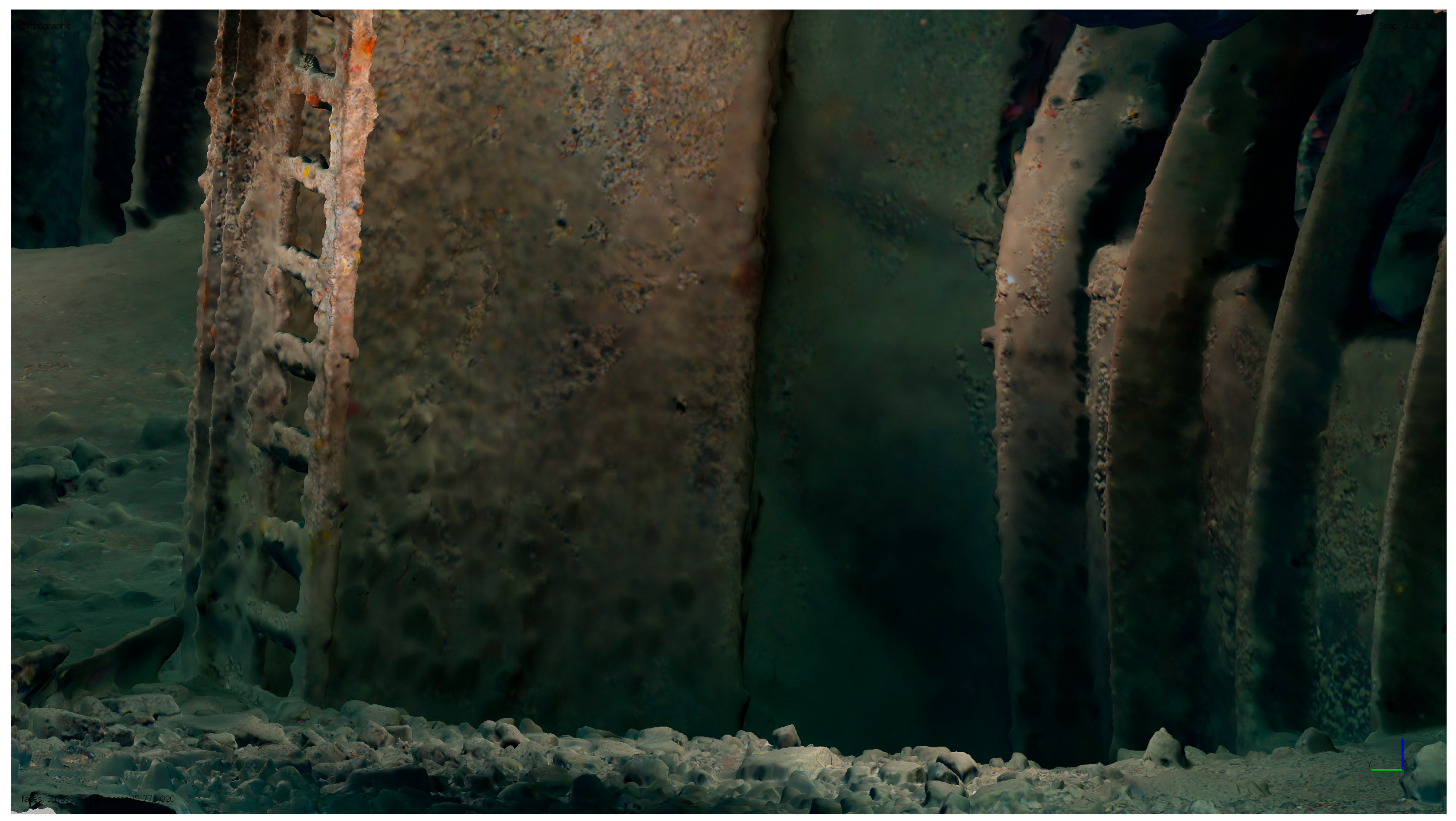 12]. Compared with other recording methods such as manual tape measurements, or single or multibeam sonar, photogrammetry offers the following several advantages: it captures complex geometries at millimetre-scale resolution, requires minimal contact with the site, and can be repeated easily to monitor change over time. The resulting 3D datasets can be georeferenced, measured, and analysed quantitatively, allowing objective comparison between surveys as well as high-quality visual outputs for interpretation, conservation, and public dissemination.