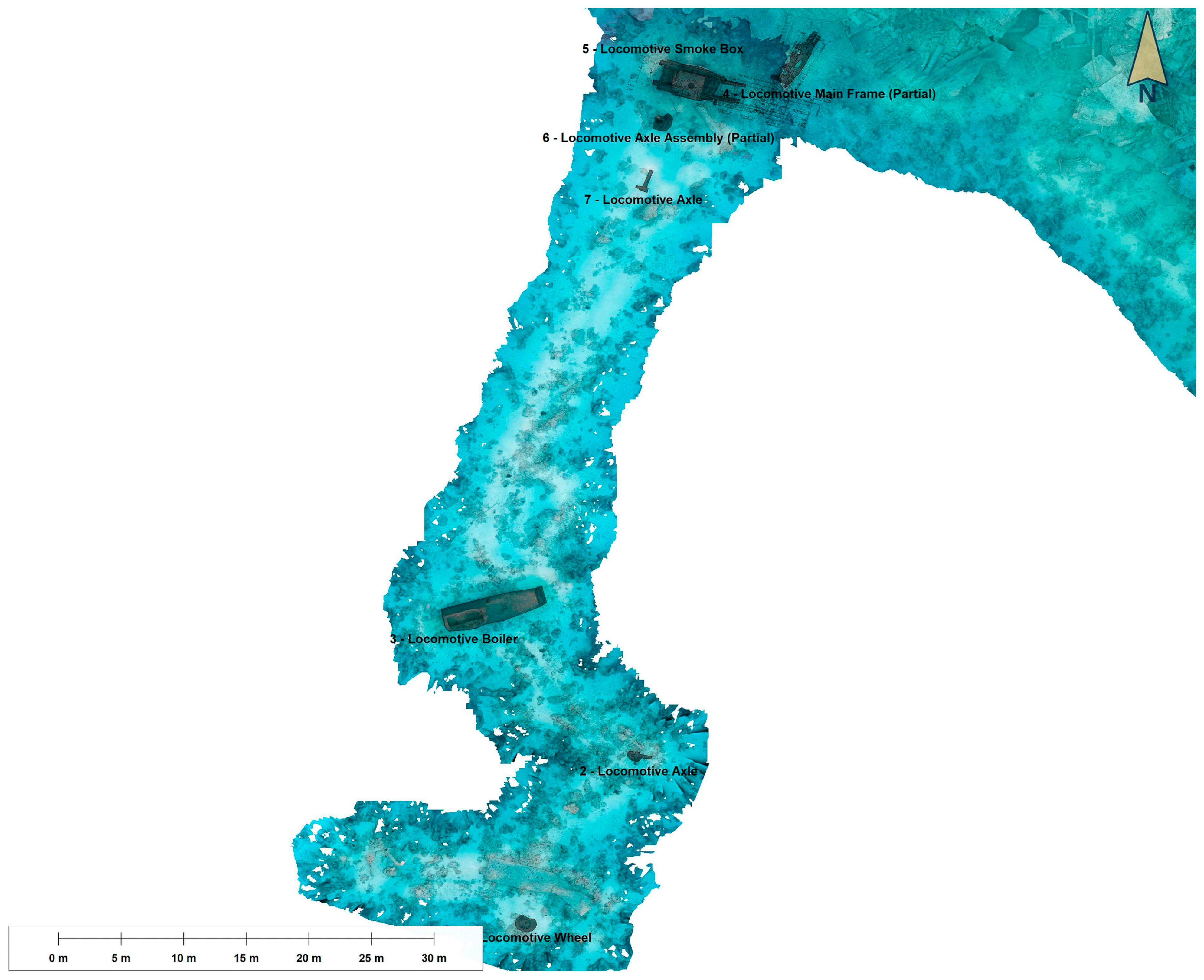 3] (p. 195) but the exact location and its relationship to the main wreck site was unknown. Using a reel and line secured to the port smoke box a search of the seabed to the southeast was conducted and located the damaged boiler lying inverted on the seabed. The guideline served as a reference for subsequent transits swum to create a broad swathe of photogrammetry to reference the boiler back to the main site. Between the smoke box and boiler, an axle and single leaf spring assembly, with wheels removed, is located approx. 27 m from its as-stowed location (