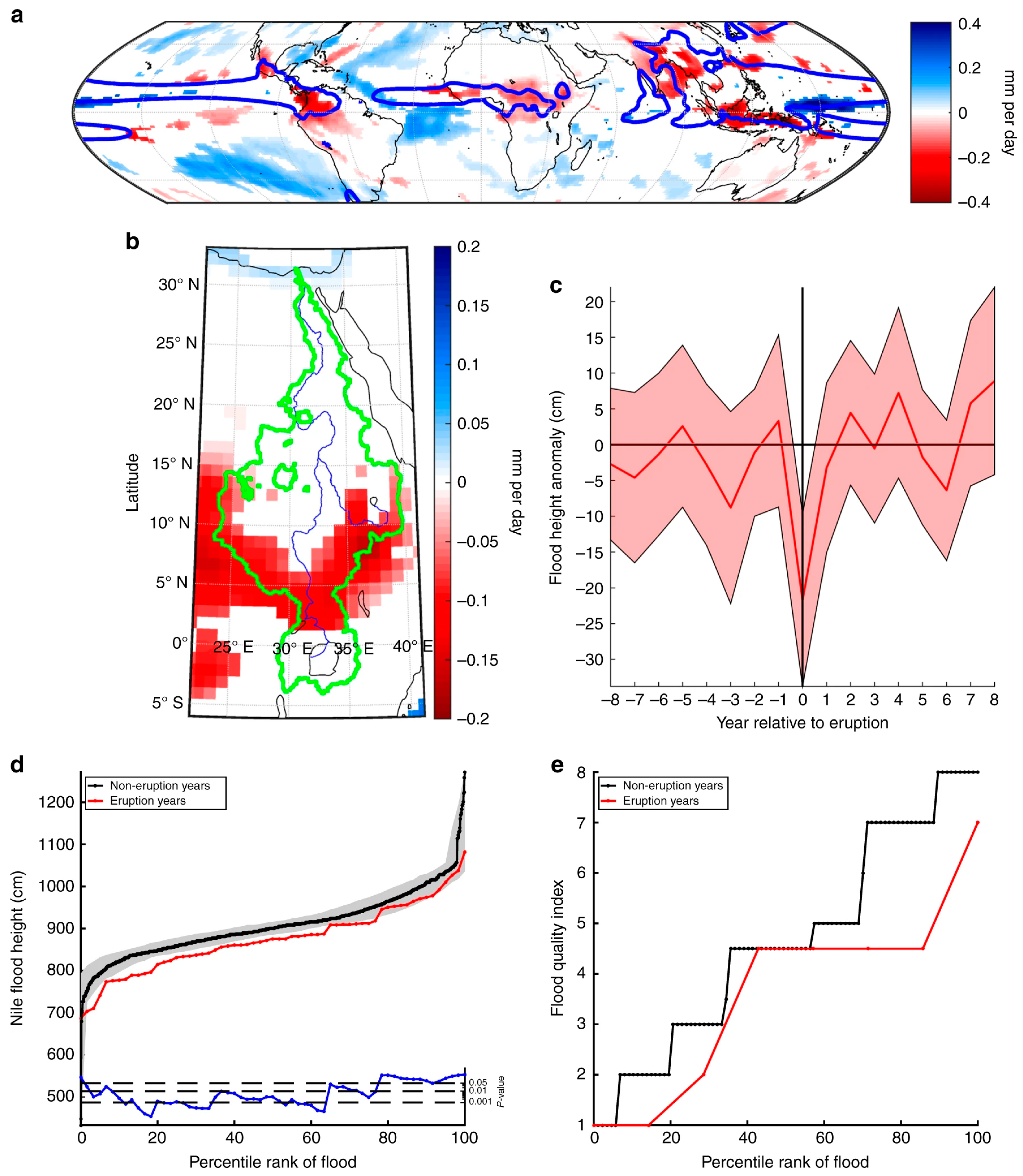 Climate model output supports this relationship. Analyzing the ensemble mean precipitation minus evaporation (P-E) response to five twentieth-century volcanic eruptions in CMIP5 (Coupled Model Intercomparison Project 5) models shows significant drying across the Nile watershed during the first summer season that contained or followed the eruption, relative to the five summers preceding it. The spatial pattern shows strongest drying in the Ethiopian Highlands—precisely the region where monsoon rainfall feeds the Nile summer flood.