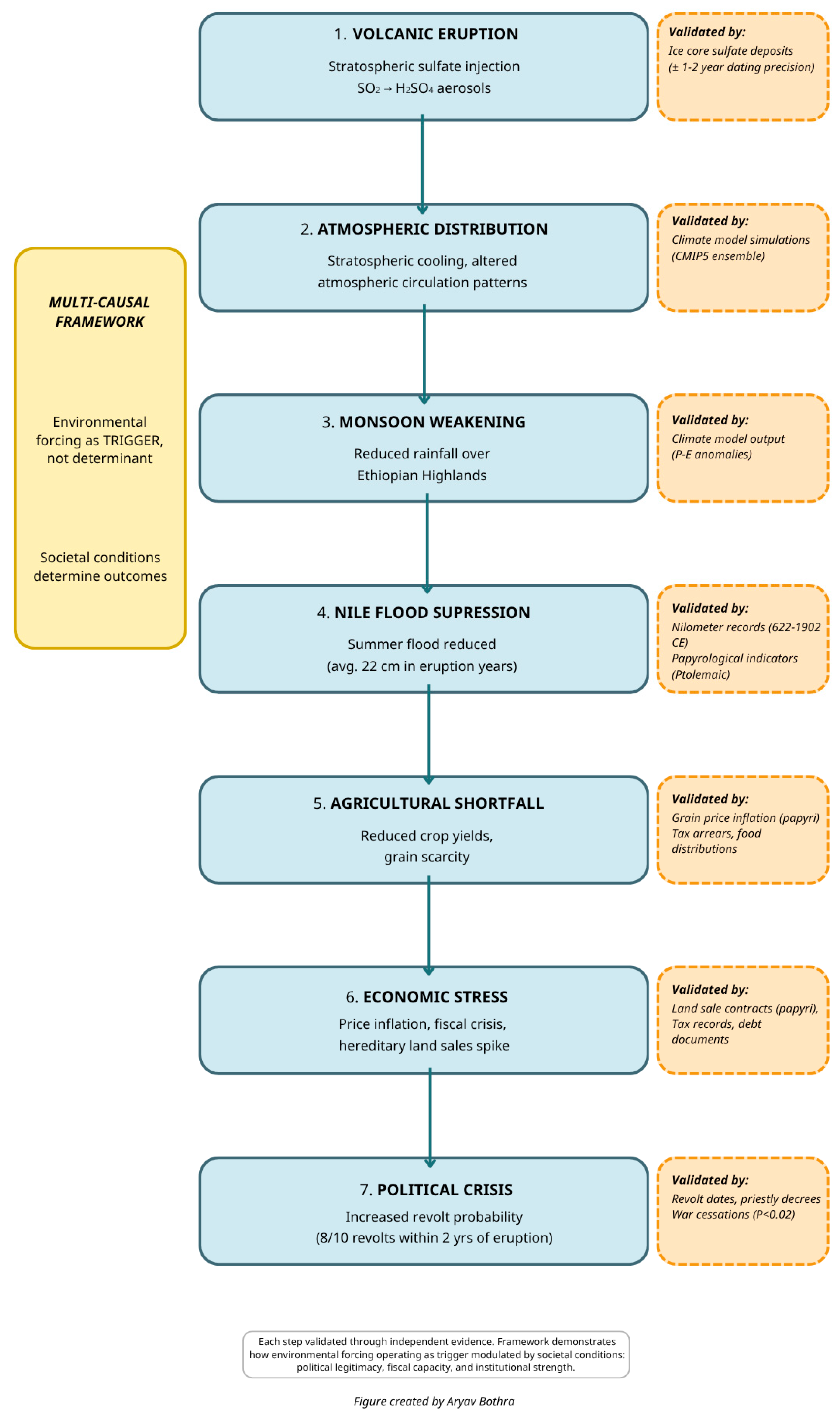 Third, causal mechanisms can be identified. The volcanic forcing pathway provides a concrete, physically based mechanism: stratospheric sulfate → atmospheric cooling → monsoon disruption → reduced Nile flood → agricultural shortfall → economic stress → political crisis. Each step can be validated through independent evidence (ice cores, climate models, Nilometer records, papyri). This is fundamentally different from vague assertions about “climate change” causing “collapse.” We can specify exactly how environmental forcing propagated through social and economic systems to produce political outcomes.