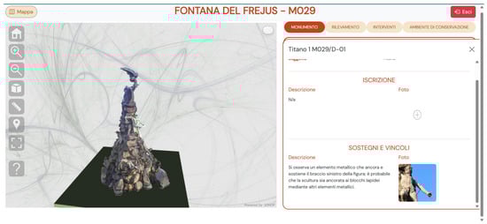 Screenshot of the platform’s form with the 3D model of the Fréjus fountain monument. The left panel displays the interactive 3D model, where compositional elements can be visually identified and selected. In this example, one of the Titan figures is selected and associated with the unique code MO29/D01. The right panel (“Monumento” section i.e., Monument) collects the corresponding descriptive data and photographic documentation for the selected element 7.