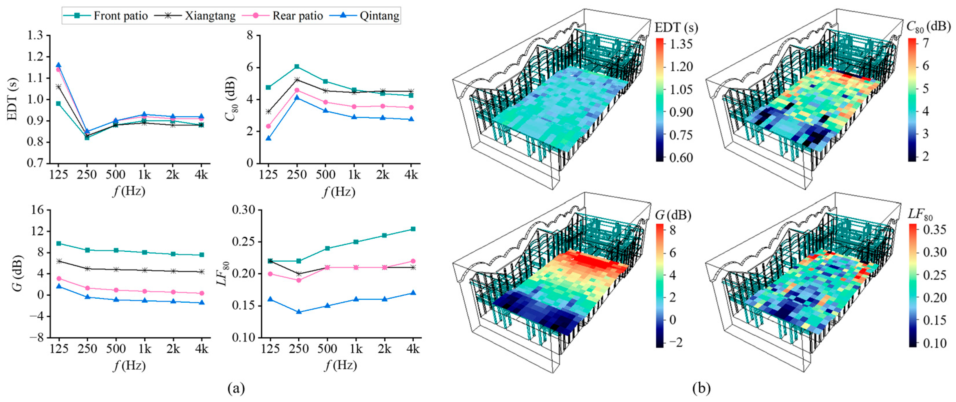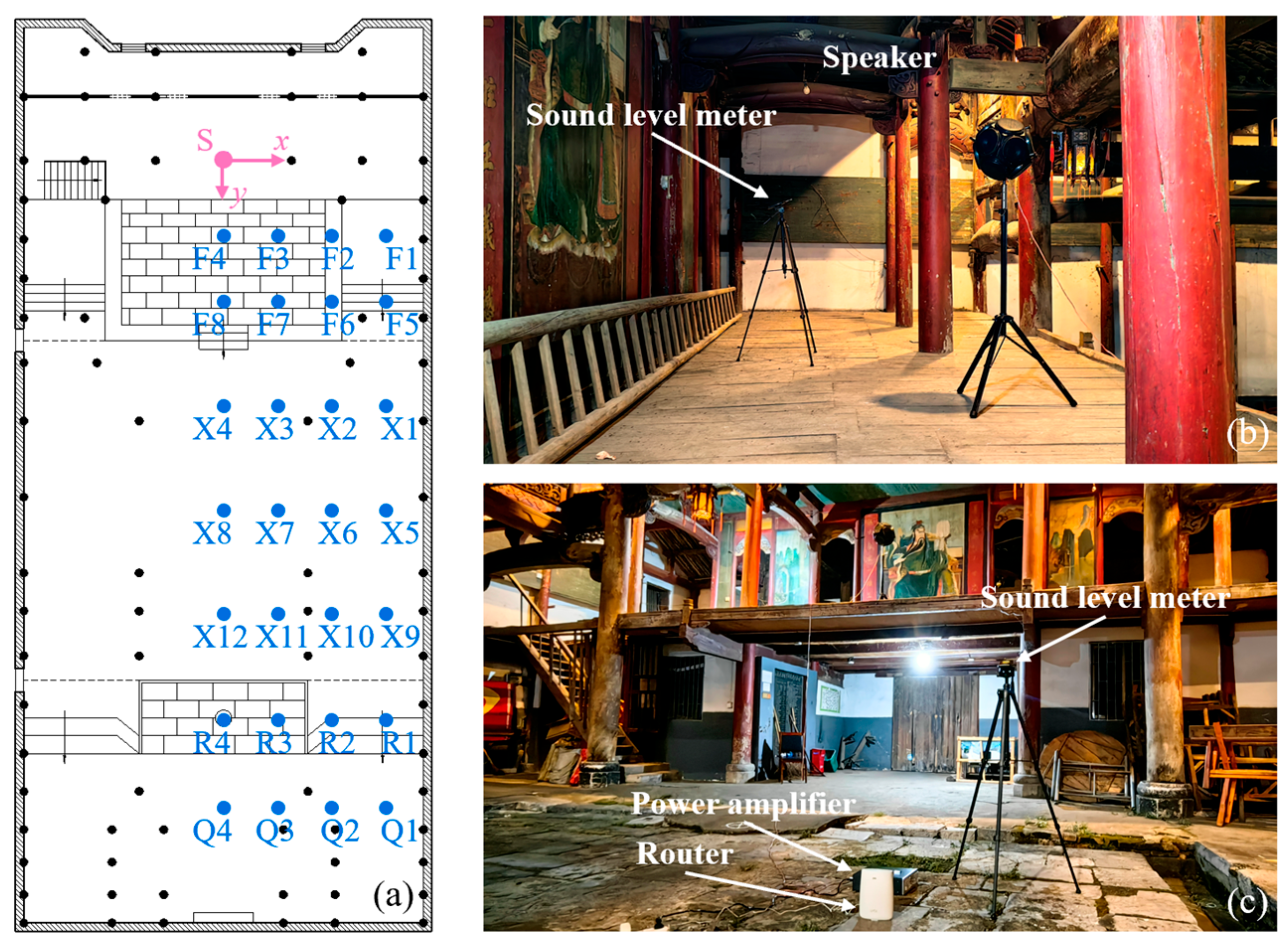 - Leng, H.; Xiong, W.; Zhou, B. The Sound Quality Characteristics of the Gan Opera Ancestral Temple Theater Based on Impulse Response: A Case Study of Zhaomutang in Leping, Jiangxi Province. Buildings 2025, 15, 986. [Google Scholar] [CrossRef]