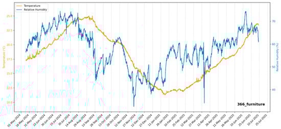 It is interesting to notice how, in such an isolated environment, each peculiar event has a great impact on the room microclimate. As an example, the abrupt drop in RH registered on 31 March 2025 corresponds to a private visit to the Apartment: the entrance door leads directly into Room 366, and the visit probably allowed dry air to suddenly enter the room. This effect is perceived in Room 368 only near the window, where single glass and historical wooden frames do not guarantee optimal insulation.