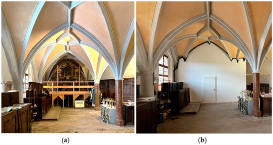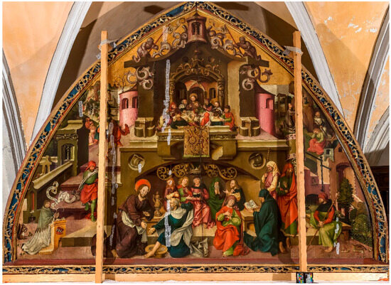 The west wall of this sacristy was occupied by an adjacent building, making it partly an exterior wall. The panel painting is inscribed and dated to 1495 and attributed to Hans Mair from Landshut [7]. As part of the basic investigation, art technological studies and material analyses were carried out (e.g., FTIR, GC-MS; EDX at the BLfD central and external laboratories; all details see [6,8]), documenting the following, briefly summarized, structure: