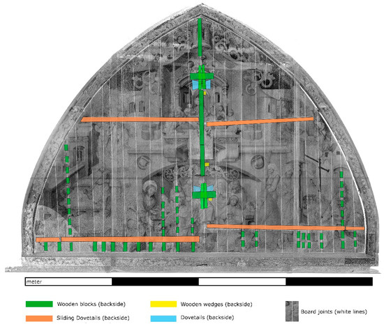 The ogival wooden panel painting with a decorative frame (H 275 × L 382 × D 2 cm) is made of 27 spruce (Picea spec.) boards glued in the direction of the grain, with four rear edge batten strips (Figure 3). The two lower ones are made of fir (Abies spec.), while the two upper ones are made of spruce (Picea spec.); they are almost 200 × 4 × 2 cm and are conically shaped inserts. Both strips on the left side (bottom and top) were dated between the 15th and 16th century using a natural radiocarbon measurement (Curt-Engelhorn-Zentrum Archäometrie GmbH). The vine carving on the decorative frame is made of lime wood (Tilia spec.). Due to the fragility of the paint layer, it was not possible to lay the painting down during the project to view the cross-section; for financial, logistical, and spatial reasons, methods such as mobile X-rays or similar could not be used to identify the cutting directions. Based on the rear view with straight grain, mostly radial sections were observed.