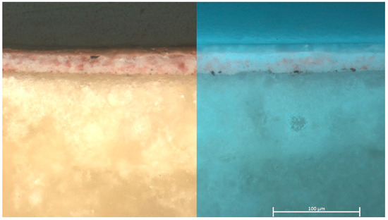Exemplary cross-section of the case study with preliminary gluing (GC-MS: animal glue), multi-layered white priming (GC-MS: animal glue with calcium carbonate), several paint layers (GC-MS: historical pigments in linseed oil) and at least two transparent overlays (GC-MS: shellac as well as damar resin and partly proportions of a drying oil) in visual (left part) and ultraviolet (right part) incident light (20:1) [© BLfD, Manuela Hörmann].