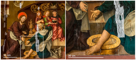 During the planning and at the project launch, the panel was already in a very fragile state of preservation. The use of the sacristy is associated with increasing comfort demands and occupational health/safety requirements. Therefore, the previously damp-cold climate developed over time through heating into a warm and dry state—especially in winter—which had a significant impact on the wooden structure of the altarpiece. Due to the cyclic material movements, it had continued to shrink and warp and the paint layer was peeling off to a considerable extent (Figure 5).