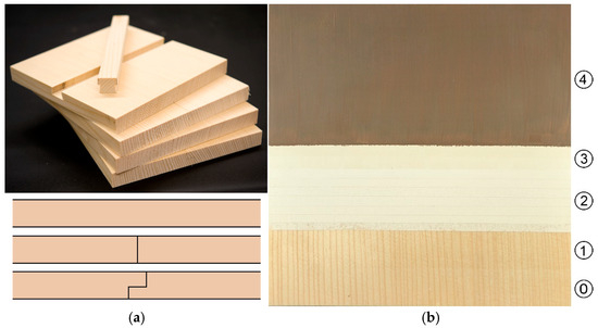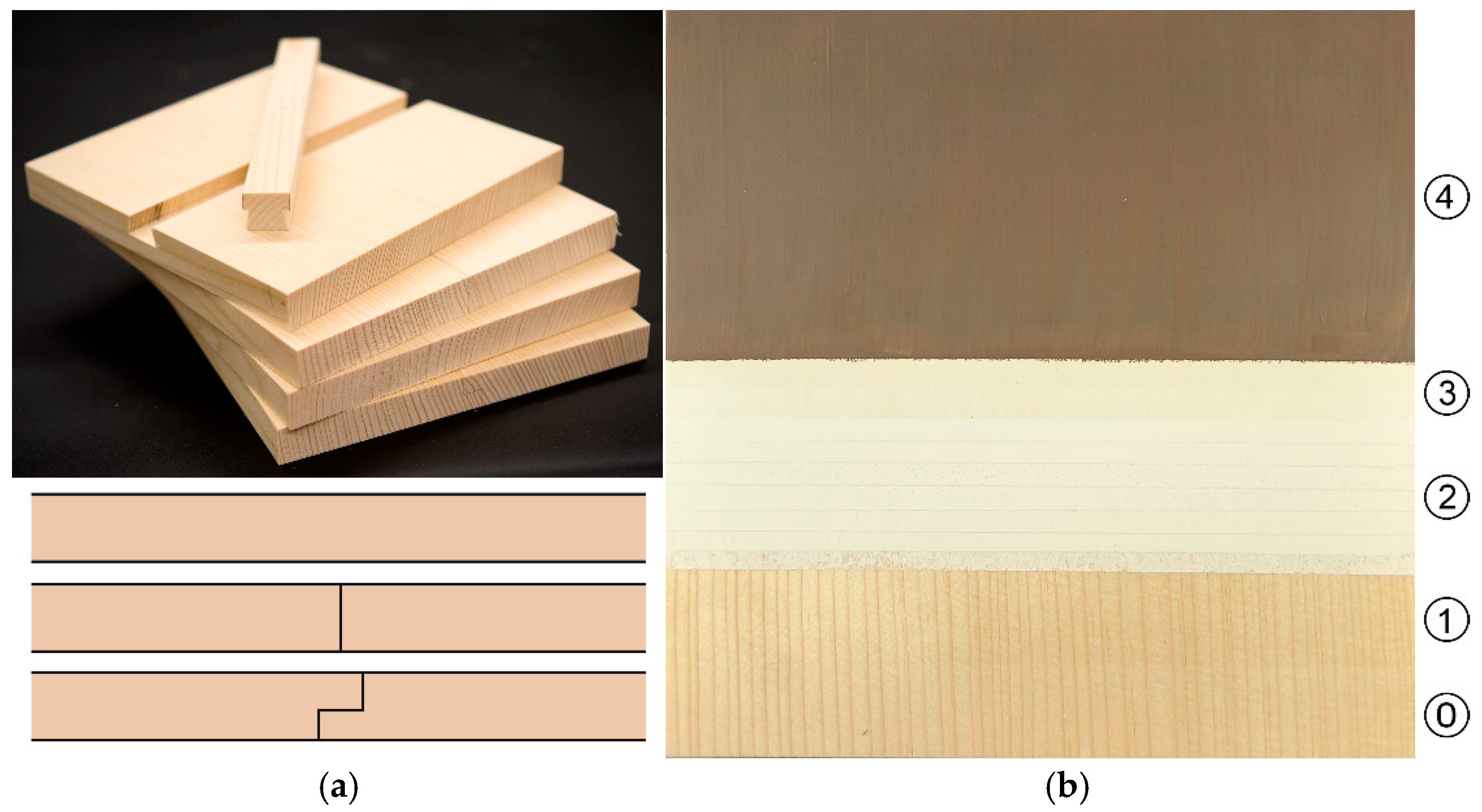 (a) Uncoated wooden test bodies (20 × 20 × 2 cm) with representation of the different joining types (no joint, end-to-end joint, lap joint, batten strip). (b) Front layer structure of the test bodies (20 × 20 × 2 cm) corresponding to the case study: 0 = Panel (Spruce); 1 = Insulation (rabbit skin glue, 7%; 1 layer); 2 = Primer (chalk-glue primer; 7% rabbit skin glue with calcium carbonate; 7 layers); 3 = Barrier layer (rabbit skin glue; 7%; 2 layers); 4 = Paint layer (linseed oil with synthetic verdigris, calcium carbonate, iron oxide and with lead) [© BLfD, Manuela Hörmann].