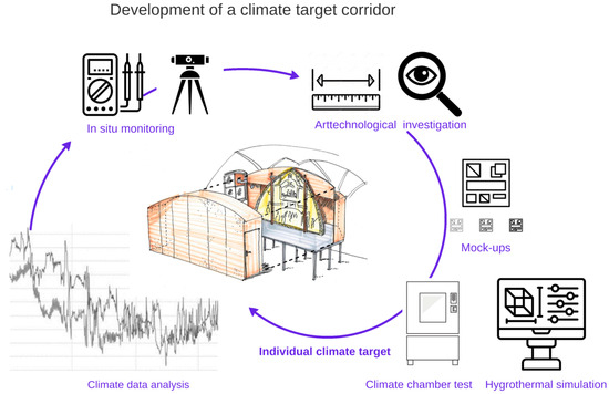 A prerequisite for successful climate adaptation measures is the analysis and minimization of existing damage causes, e.g., through structural, technical, organizational, and other actions. If an unsuitable indoor climate is identified as a primary factor, establishing a suitable climate corridor is a sensible next step. The analysis of the current state and the development of a climate corridor goal [24], e.g., for moisture and later long-term stabilization, should only be carried out in close coordination with experts, under conservation and measurement supervision, and with a critical assessment of risks and opportunities. The material-specific requirements in the targeted corridor must also be taken into account. Regarding further risks to art and cultural heritage, a general reference should be made to the ‘10 agents of deterioration’ [25]. For a comprehensive risk assessment the website of the Safety Guidelines for Cultural Property SiLK [26,27] offers a comprehensive list of approaches, as well as further literature and references.