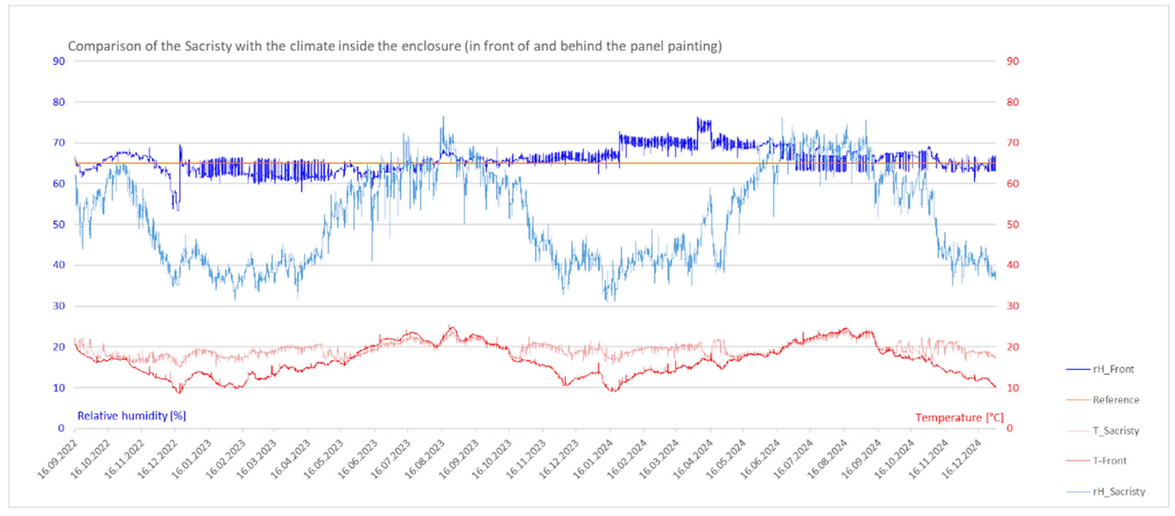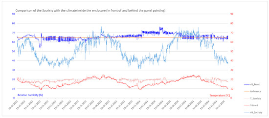 The evaluation of the project data (2022–2024) compares the outdoor and indoor climate (sacristy, enclosure, and near field) at the front and back of the panel, as well as at various elevations (beneath the work platform and at three elevations of the panel). Figure 10 shows an example of the sacristy climate compared to the climate in the enclosure (panel front) and to the reference at 65% rH; further diagrams and discussion see [6].
