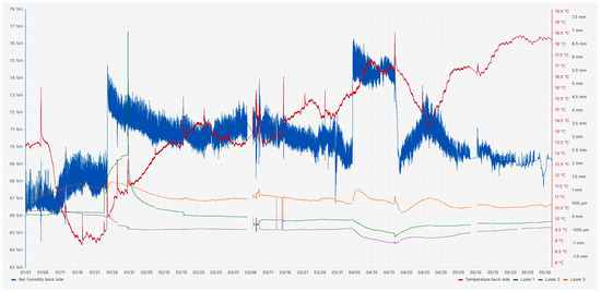 Relative Humidity in the enclosure (panel front and back) and laser measurements while performing the in-situ humidification from January to May 2024 [export: Florian Lindner; Visualization with Grafana, Version 12.2.1].