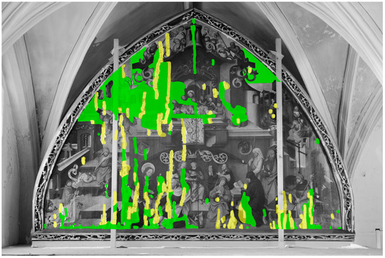 Mapping of the detached paint layer areas. Green = preservable by project end (2024); yellow = not preservable by project end (2024) [© BLfD, Manuela Hörmann].