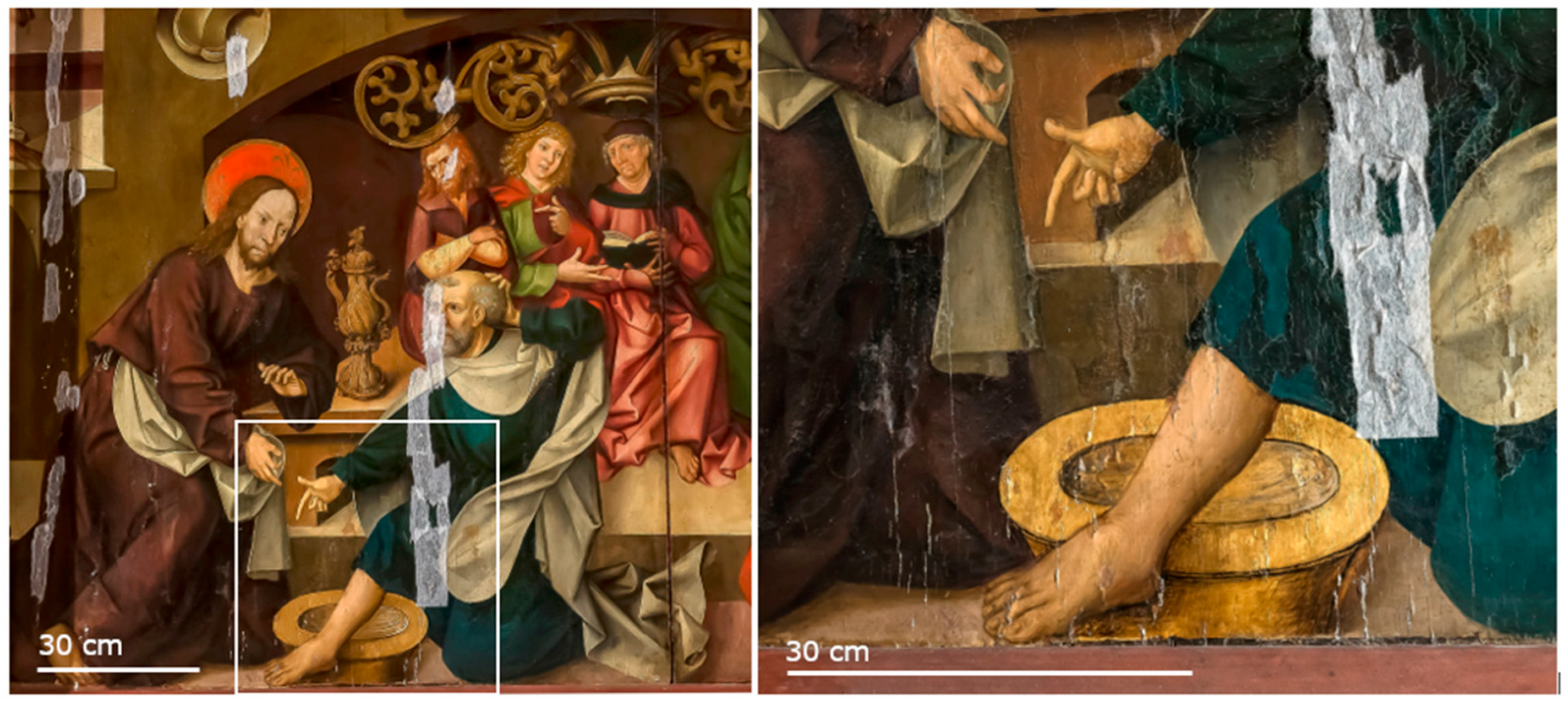 The paint layer structure is typical for a late medieval panel painting from southern Germany and consists of a preliminary gluing (animal glue), partial linen canvas applications, a multi-layered white priming (animal glue with calcium carbonate), gilded parts in the background (white and red clay minerals ‘bolus’, real gold) as well as several paint layers (historical pigments in linseed oil) and at least two transparent overlays (shellac as well as damar resin and partly proportions of a drying oil); exemplary cross-section see Figure 4, further details [6,8].
