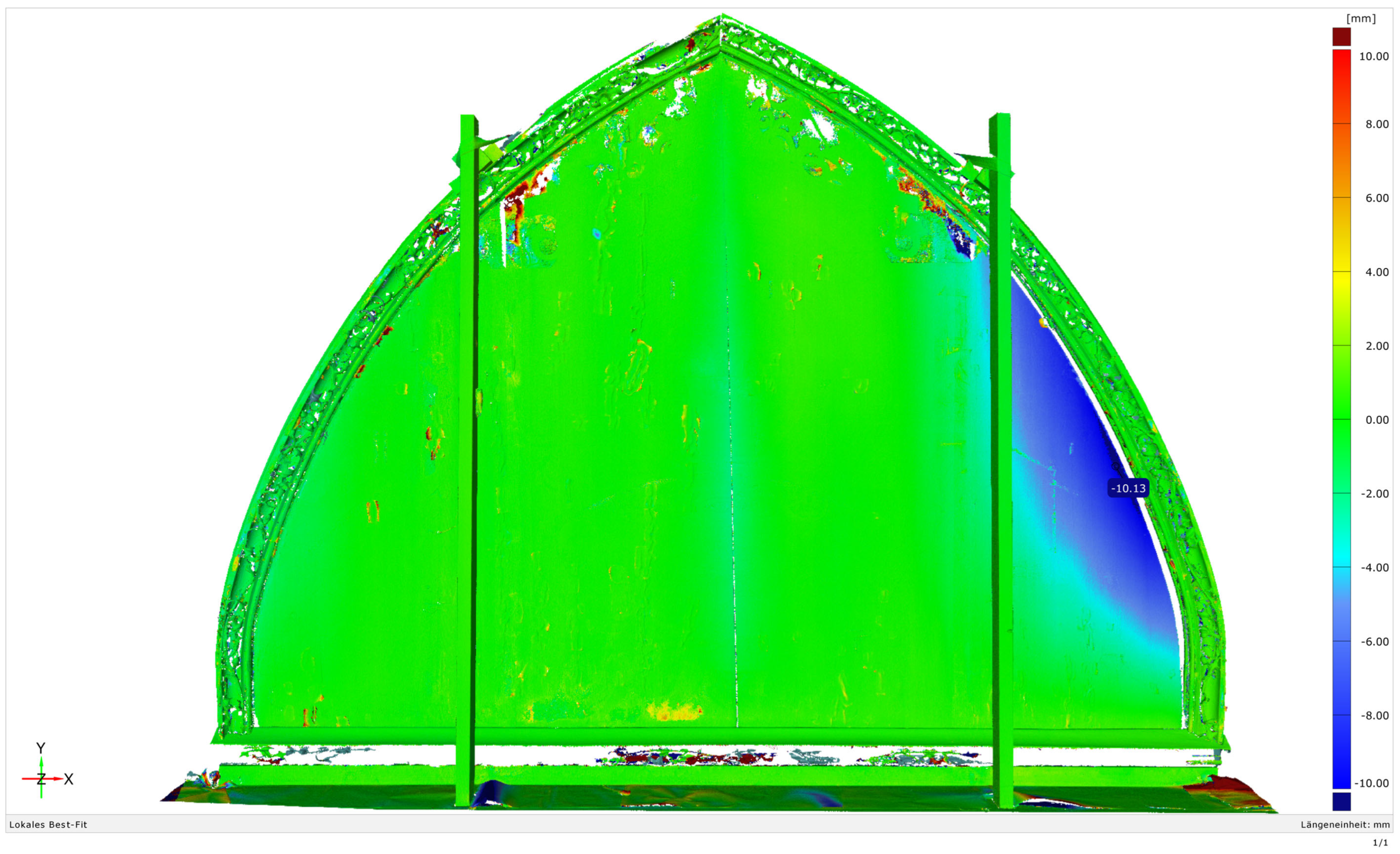 False color matching of two 3D scans from 27.01 (x January 2022 = 17.4 °C/53.2% rH) and 24 March 2022 (x March 2022 = 18.5 °C/43.2% rH) to demonstrate the movement of the board with a maximum difference of 10 mm with an average change of ~10%-points [© KDWT, Leander Pallas].