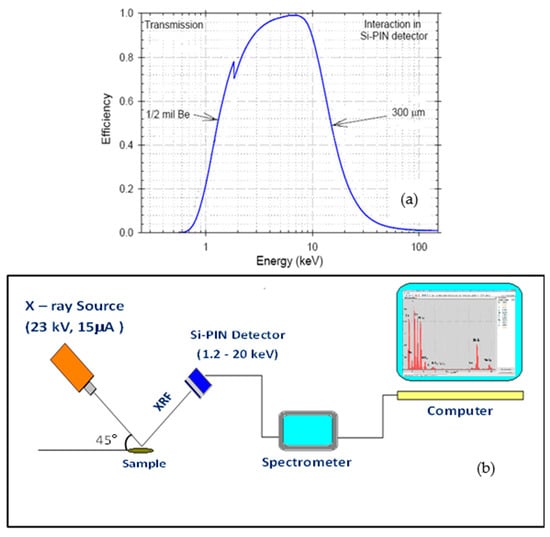 (a) Detection efficiency of the used Si-PIN detector, (b) scheme of the portable XRF system.