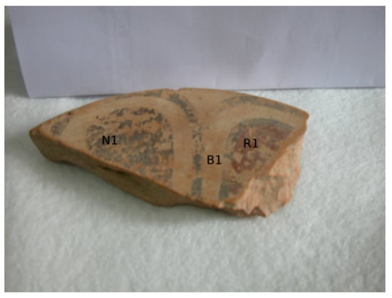 Sample # 1: Figure 4 represents an image of the ceramic fragment of the antefix analysed at ten different points on the front surface (R1 = surface area of red colour, N1 = the area of black colour, and B1 = area of white colour). A further ten points were analysed on the back surface of the specimen, showing only the clean surface of the clay. For each of these points, a representative pXRF spectrum of the elemental compositions is shown in Figure 5. The white pigment (see Figure 5a) indicates the predominance of Fe and Ca contents. The black pigment (see Figure 5b) reports the main contents of Fe and Mn, as well as the red pigment (see Figure 5c), exhibiting a dominant Fe concentration. The clay on the back side of the antefix shows Fe, Ca, Ti, and other trace elements.