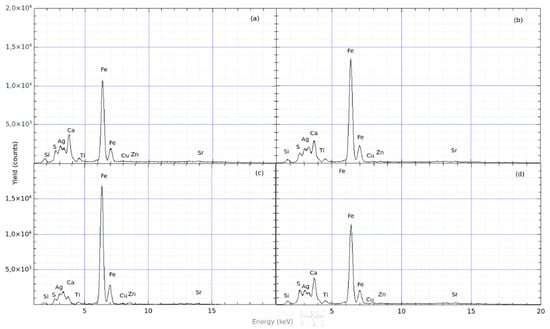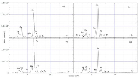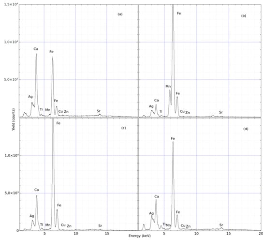 pXRF spectra acquired from different spots on sample # 3 (architectural fragment). The spectra show the yields of the compositional elements as a function of the energy of X-rays generated by the (a–d).