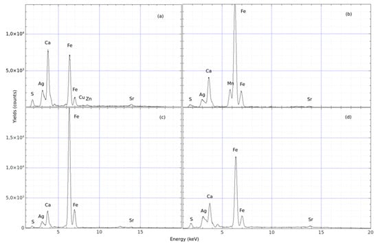 XRF spectra acquired from different spots on sample # 4 (architectural fragment). The spectra show the yields of the compositional elements as a function of the energy of X-rays generated by the (a–d).