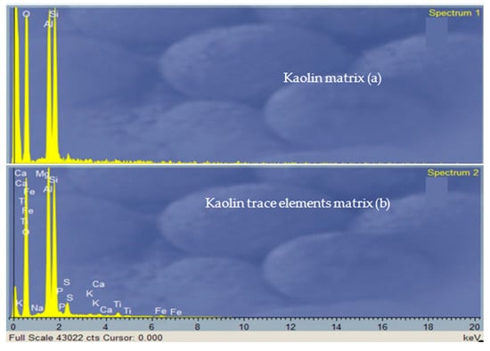 This comparison shows that the relative composition of the main elements is similar; for example, for kaolin, the experimental average ratio Fe/Ca is 0.56 in white kaolin (see Figure 15a) and about 9.27 in red kaolin (see Figure 15b). However, large differences arise between the content of S, Ca, and Sr, which, in kaolin, are much higher than in clay. These differences can be justified by the thermal treatments experienced by the clay during cooking. The melting temperatures of the sulphur, calcium, and strontium are respectively 119 °C, 768 °C, and 838 °C. The processes of baking clay in the oven are generally carried out, as in the past, reaching temperatures of about 900–1000 °C and maintaining the piece at this temperature for times of about 10 h. Such processes, producing fusion of some elements, cause the reduction in the concentration due to the effects of vaporisation and diffusion, so that sulphur can be almost absent in clay, while strontium and calcium can be reduced to a concentration of about one-tenth of the value in the clay, according to the experimental measurements reported in Table 6.