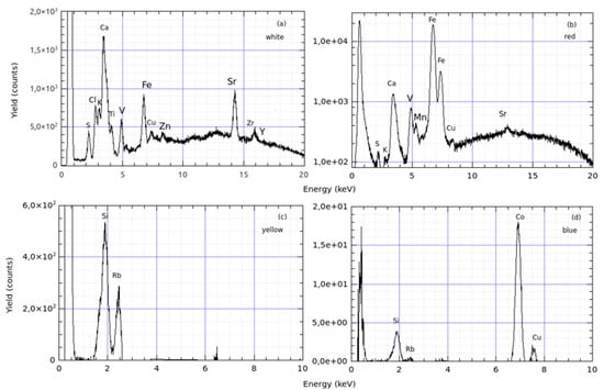 In Figure 14a–c, the presence of rubidium (Rb) and strontium (Sr) was revealed in findings in areas in Southern Italy [5]. In Figure 14d, the coexistence of cobalt (Co) and silica (Si) suggests their use in the production of the blue pigment, while copper (Cu) typically acts as a chromatic modulator, influencing the final shades of the blue colour and providing a printing feature of the used blue pigment.