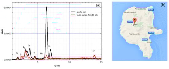 A comparison between the average composition of the fragments, subjected to a firing process, and a sample of pressed powder of kaolin not subjected to heat treatment, both analysed by the pXRF technique, is reported in Figure 15, where a map of Lipari reports the site S1 where the kaolin samples were extracted.
