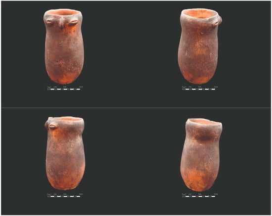 The vessel is an ovoidal restricted pot with an elongated and articulated body as shown in Figure 1, which presents similarities with the features mentioned in the identification of the P.Q.Ch.143 type on page 94 of the Echeverría (1976) thesis [20]. The container presents an anthropomorphic face made of appliques, with coffee bean-type eyes and an ovoid nose. Its surface has a rustic smoothing and reddish color, and it is eroded in some areas. Carbon traces and soot concentrations are present on the outer surface.