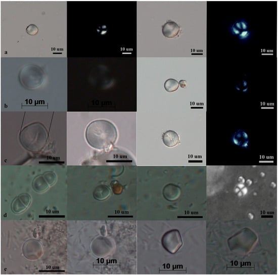 As part of the present study, the research team conducted experiments to identify starch granules using a simulation of pre-Hispanic cooking with corn and potatoes. Archaeological fragments were then analyzed to validate the findings [45]. Based on these experimental simulations, a protocol for identifying starch in archaeological utensils was developed, which established the optimal procedures for extracting and detecting starch from small samples [1,47,48,49,50,51,52,53,54]. Different parameters were alternated to establish the most effective approach. The following validated method was employed to analyze a sample of 0.25 g for the presence of starch granules. The sample was placed in an Eppendorf tube and covered with cesium chloride (1.79 g/cm3), which was shaken for 10 min (min) and centrifuged at 3000 rpm for 20 min (minisSpin—Hamburg, Germany). The resulting floating fraction was transferred to a new tube with distilled water and centrifuged at 9000 rpm for 8 min, and this step was repeated. The supernatant was discarded, and the remaining residue that was believed to contain starch granules was placed on a slide with a drop of glycerol. Identification was performed using an Olympus BX53F optical microscope—Tokyo, Japan. with a built-in Infinity 2 digital camera with polarized capacity. The slide was initially observed with a 10× objective to identify the starches present, then changed to a 40× objective to capture photographs.