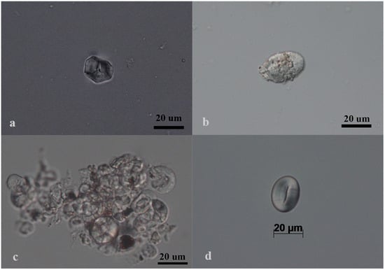 Starch grains from additional specimens recovered from the Chilibulo–Chillogallo vessel were examined under bright-field microscopy. The analysis revealed granules from several plant taxa, including Zea mays (maize) (Figure 4a), Canna spp. (achira) (Figure 4b), a cluster of gelatinized maize starch granules (Figure 4c), and Phaseolus spp. (bean) (Figure 4d). These observations provide further insight into the variety of plant resources processed or stored in the vessel.