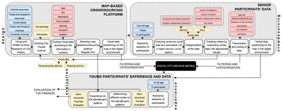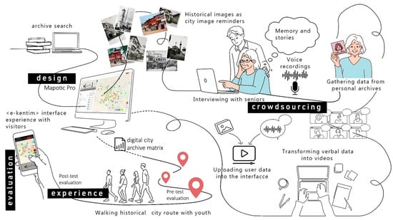 The e[kent-im] digital urban memory transmission model was developed using a multi-layered methodological framework consisting of four main stages: design, crowdsourcing, experience, and evaluation. Each stage was carefully structured to integrate archival research, senior community participation, digital mapping, and user-centered evaluation, ultimately aiming to safeguard and transmit cultural heritage and urban memory in a participatory and sustainable manner (Figure 1).