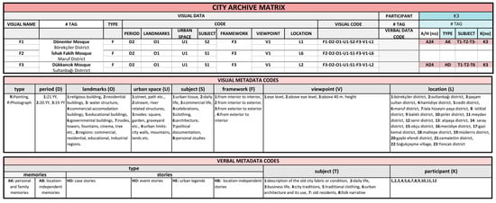 The collected visual and narrative data were integrated into a custom-designed web-based interface and systematically organized using a Digital City Archive Matrix (Table S1), in which both tangible and intangible heritage layers were categorized, tagged, and structured using metadata parameters. This phase prioritized depth, richness, and narrative diversity over participant quantity, in line with qualitative heritage research practices. The sample coding of this archive is shown in Figure 6, visual and verbal metadata code are used to create visual and verbal codes for each item.