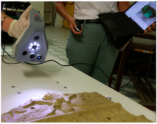 The three-dimensional survey of the artifacts was performed with an integrated, multi-instrument approach. Two different structured light projection scanners were employed to obtain the geometric information (Figure 3), while a mirrorless camera was used to acquire the objects’ texture.