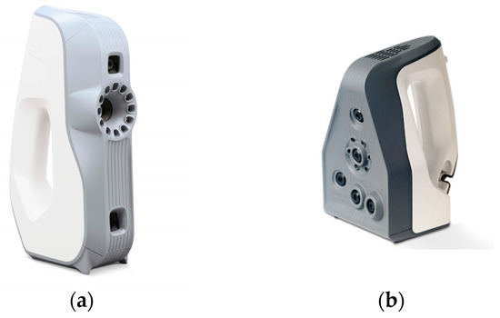 Artec 3D scanners used in the work: (a) Eva (0.1 mm nominal accuracy); (b) Spider (0.05 mm nominal accuracy).