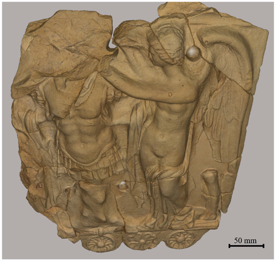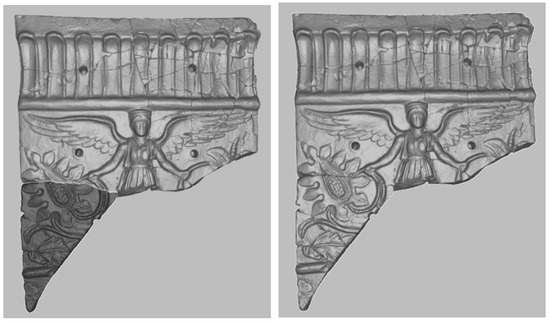 The 3D survey of the “Winged Victories” slab is reported here as an example of the general workflow adopted. The object was first placed on a flat, unobstructed support that would allow it to rotate and move around. First, the Eva scanner was used to obtain a framing survey of the object’s overall geometry and side edges. Next, a detailed scanning of the topside of the slab, i.e., the figures finely carved in the terracotta (described in Section 1.2), was conducted. The two datasets obtained with the different scanners were then processed using the proprietary software Artec Studio Professional (v.16). First, each individual scan had to be registered separately to ensure proper alignment of the raw geometry frames. Next, the separately registered scans were oriented in the same reference system to reconstruct the entire geometry of the object. If the scan was interrupted and then resumed from a different viewpoint, the data were no longer oriented in the same reference system and had to be co-registered during post-processing. This was accomplished by selecting homologous points between the different scans’ surfaces, which were then finely registered with the software’s alignment tools, which employed an Iterative Closest Point algorithm [22].