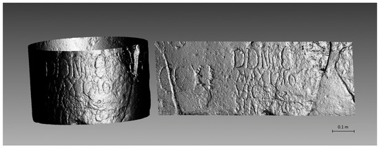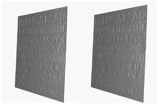 After the operation was completed, a dense point cloud was obtained (the software used can only geometrically project point clouds, so the operation was performed considering the mesh vertexes), which was then converted into a solid mesh again in MeshLab software (www.meshlab.net (accessed on 27 December 2024)), using the ball-pivoting surface reconstruction algorithm [26]. Moreover, having applied a digital lighting model to emphasize the lines of the engravings, it was noticed that the writings could be read from a fixed viewpoint for the unrolled surface, while for the non-unrolled model, it was necessary to rotate and enlarge the object model while also adjusting the direction of the lights. Figure 11 shows an example of the difference between the unrolled surface (right), compared with the same portion of the milestone model before the geometric projection (left). As can be seen, applying the same shader (“glass shader” in MeshLab software), the words “Maximo” can be read clearly and at once, only in the unrolled mesh.
