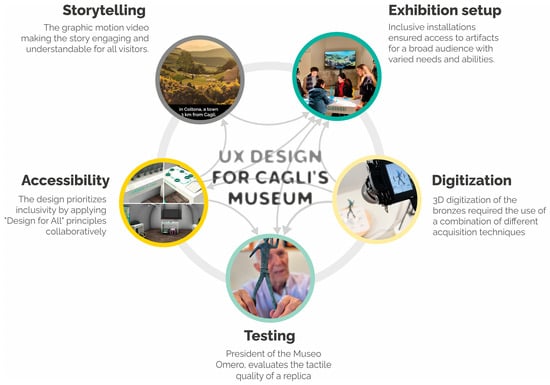 Designing a phygital experience for archaeological materials requires a preliminary definition of narrative elements to align technological choices with cultural content. The user experience (UX) design at the Archaeological and Via Flaminia Museum in Cagli (Figure 1) follows “Design for All” principles, emphasizing inclusivity through collaboration with individuals with disabilities. A central aim of the project was to symbolically “return” bronze statuettes to the museum, addressing a cultural gap for the community while promoting the appreciation of local archaeological heritage. This approach not only integrates local history into accessible museum features but also strengthens the connection between the museum and its surrounding territory. Additionally, the project addressed practical constraints by designing mobile and flexible installations suitable for a small-to-medium-sized museum with a limited budget. Developed through partnerships among universities, museums, and cultural organizations, the project promotes active engagement with cultural heritage, fostering a stronger community connection while addressing financial and management challenges. By combining interactive storytelling with tactile replicas of artifacts, it enables visitors to engage more deeply with the region’s cultural heritage. These replicas, produced using advanced digitization techniques and 3D printing, provide sensory access to fragile or inaccessible artifacts, ensuring a more comprehensive understanding of the exhibits.