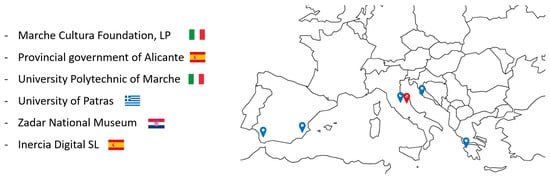 The research presented in this paper is part of the ERASMUS+ project “Next-Museum: Stimulating digitization at small and medium-sized museums through the enhancement of the Digital Curator”, within the framework of vocational education and training [66]. The project brings together a partnership of six institutions—three museums and three educational organizations—located in the Mediterranean region. Specifically, the partners include the Marche Culture Foundation (Italy), the lead organization; the National Museum of Zadar (Croatia); the Museum of Fine Arts of Alicante (Spain); Inercia Digital (Huelva, Spain); the University of Patras (Greece); and the Polytechnic University of Marche (Italy) (Figure 2).