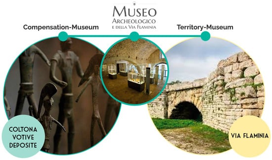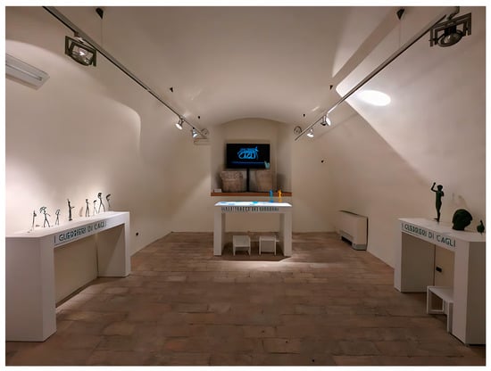 On the one hand, the museum also emphasizes its role as a “compensation museum” (Figure 3), aiming to restore visibility to artifacts that have been removed from their original contexts. In fact, central to the museum’s narrative is the Stipe di Coltona (Coltona Votive Deposit), one of the most significant discoveries in the territory of Cagli, currently housed at the National Archaeological Museum of the Marche and first described by Giuseppe Mochi in 1878 [68]. The votive deposit comprises nine bronze statuettes depicting Mars in full battle attire and three artifacts of Etruscan Hellenistic style, dated between the 6th and 4th centuries BCE. These objects were part of a votive deposit near the “Strada di Molleone”, an ancient path connecting Fossombrone and Cagli during prehistoric and protohistoric times.