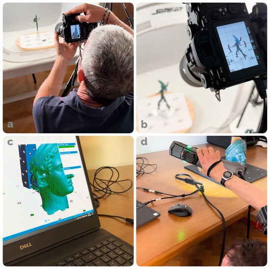 (a,b) Photogrammetry image capture. (c,d) Image acquisition via a structured-light 3D scanner. Photos by the authors.