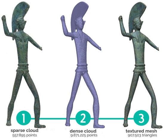 The 3D reconstruction process was conducted for each artifact using Agisoft Metashape (Version 2.0.0) software, adhering to its standard workflow (Figure 6). This process included image alignment, the insertion of markers for metric reference and alignment optimization, the generation of a dense point cloud, and subsequently, the creation of the mesh model. The resulting mesh models were further processed in Meshlab to correct topological errors and close any surface holes. In total, 27 models were successfully created.