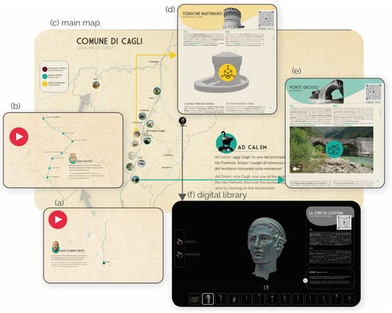 Conceptual scheme of the story map: (a,b) Introductory video with the geographical and historical context of the Via Flaminia; (c) main map of Cagli’s municipality featuring archaeological points of interest (POIs); (d,e) informative sheets on archaeological sites with various digital content; and (f) digital library of the 12 bronze statuettes. Image by the authors.