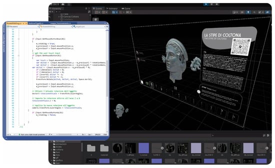 The Unity 3D development platform and User Interface (UI) standard assets were used to integrate content and interactions, as well as to generate the application necessary for the experience (Figure 10). Videos were incorporated in .mp4 format at 4 K resolution, optimized with a low bitrate to ensure smooth playback. Three-dimensional models, previously obtained (see Section 4.2), underwent an optimization process crucial for using reality-based models in XR applications. Specifically, high-poly models were decimated to create low-poly versions, followed by the baking of diffuse and normal maps to transfer the features of the high-poly model onto the unwrapped textures of the low-poly model. This workflow was executed using Blender software (version 3.6.0). Finally, the optimized 3D models were imported into the scene in .fbx format, while the textures were added as 4 K .jpeg files.