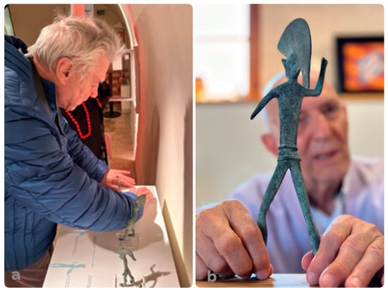 (a) Validation phase conducted by the Italian Union of the Blind and Visually Impaired (UICI) of Pesaro; (b) Aldo Grassini, President of the Museo Omero, evaluates the tactile quality of a replica. Photos by the authors.