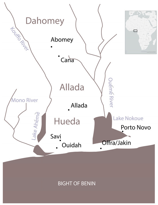 The Kingdom of Dahomey, now part of the Republic of Benin, was a unique centralized state on the Bight of Benin in West Africa, composed of people who identified ethnically as Fon, and occupying part of a coastal region that came to be called the Slave Coast (Figure 1). Spanning almost three centuries, from the early 17th to the late 19th centuries, Dahomey was among the most effective military powers in the region for most of that duration, and arguably the largest slave trading nation in West Africa. It was especially renowned for its unique female fighting force, coined the Dahomean ‘Amazons’ by contemporary Europeans—an exceptional corps of women soldiers and palace guards at the direct command of the king. Notably too, Dahomey’s royal arts were unlike any other regional artistic tradition, incorporating the cultures of other conquered African peoples, as well as European and Islamic cultures, encountered through Dahomey’s long-standing affiliation with foreign slave traders [1].